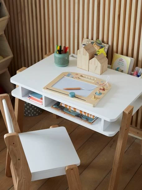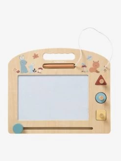 On se souvient tous du plaisir à dessiner avec une ardoise magique ! La voici dans une version revisitée en bois, avec son stylet et ses 3 formes à tamponner. L’enfant dessine ou tamponne une forme sur l’ardoise, puis efface son oeuvre en faisant glisser la petite poignée en bas de l’ardoise… Vraiment magique !