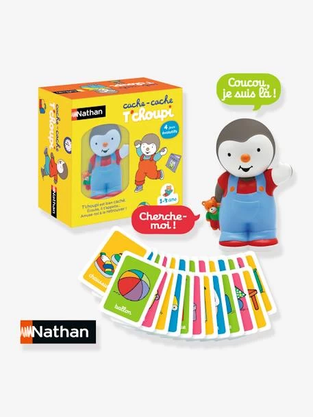 Cache-cache T’choupi NATHAN est un jeu Ă©volutif pour grandir et s’amuser avec T’choupi, l’ami des petits. Entre 6 et 12 mois: Coucou, je suis lĂ ! Devant bĂ©bĂ©, on cache T’choupi sous un tissu. T’choupi parle et bĂ©bĂ© comprend ainsi qu’une chose peut exister mĂŞme lorsqu’il ne la voit pas.