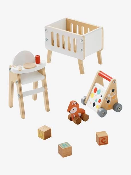 - Comprend : une table Ă langer avec tapis de change, une armoire, un lit, une couette, un portique d’Ă©veil, un trotteur, une chaise haute avec assiette, cuillère et gobelet, des jouets cubes et un renard Ă roulettes