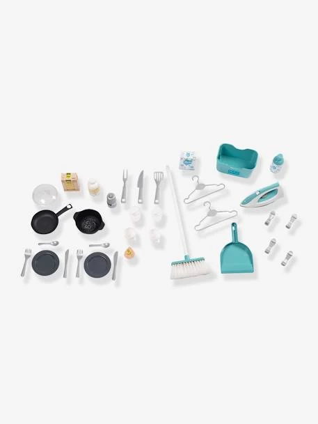 Pour un maximum de fun, la cuisine Clean Tefal est vendue avec de nombreux accessoires dont 1 poêle, 1 grappe BBQ, 1 casserole, 2 tasses, 2 verres, 2 assiettes, 2 couteaux, 2 fourchettes, 2 cuillères, 3 capsules à café, 1 salière poivrière cric crac, des boites factices, 1 balai, 1 pelle, 2 cintres, 4 pinces à linge et 1 fer à repasser avec des fonctions mécaniques.