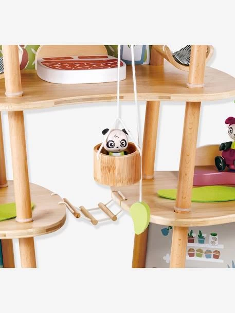- La maison comprend quatre figurines de panda, deux hamacs, un lit, une coiffeuse, un canapé, une table à thé, deux tapis de sol, un parasol, une table avec deux sièges en souche, une cheminée, un poêle, deux assiettes, deux tasses, une casserole, un panier élévateur sur une ficelle, un pont suspendu, un toboggan, une échelle de corde.