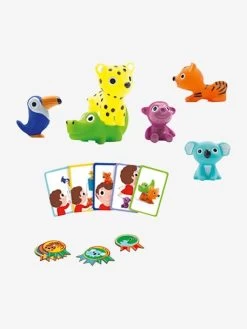 - Contient : 6 figurines en plastique souple (toucan, crocodile, léopard, singe, tigre, koala), 20 cartes défi et 12 médailles en carton