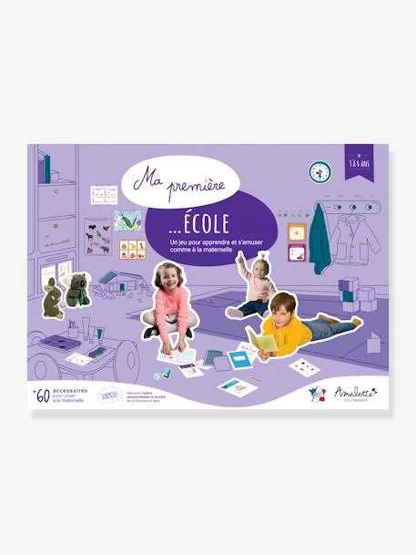 Ma Première école est le coffret idéal pour imiter le maître ou la maîtresse dès 3 ans. Il contient de nombreux accessoires pour remplir le panneau de présence avec les étiquettes de prénoms, expliquer les leçons sur les voyelles, les chiffres, le temps…, donner les cahiers et exercices à ses élèves et jouer avec les cartes animaux de la ferme et fruits et légumes… en attendant de pouvoir jouer à « Si j’étais la maîtresse, » également disponible sur notre site.